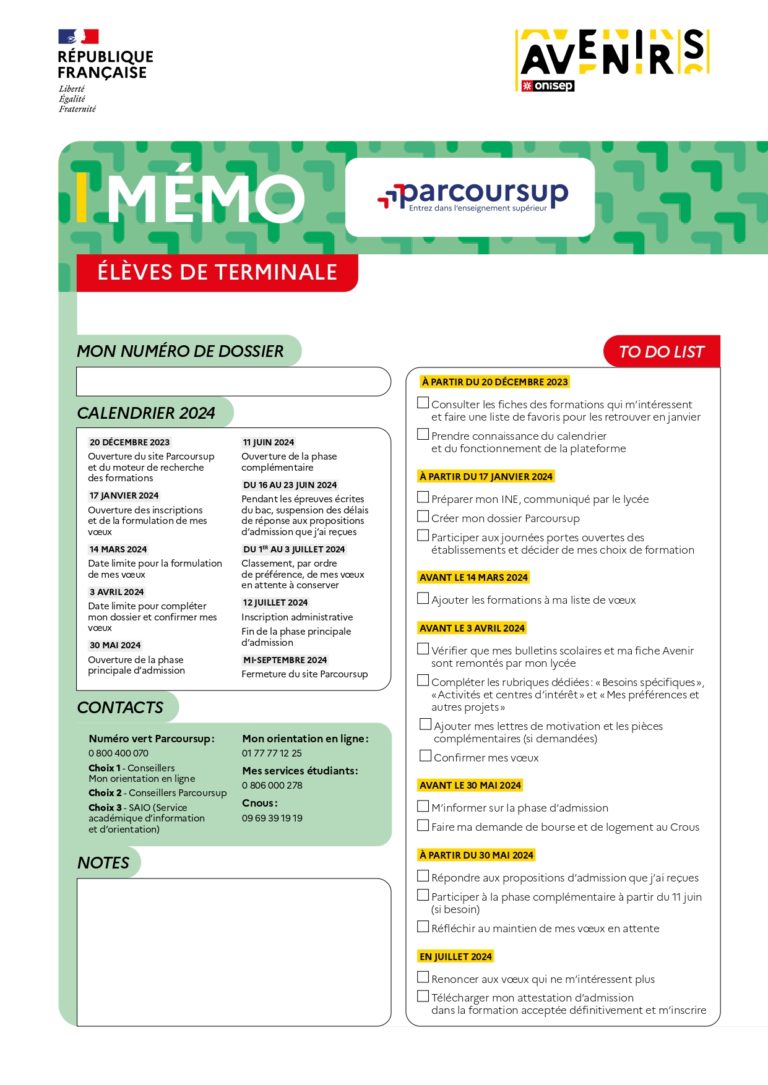 Mémo Parcoursup de l’ONISEP pour les élèves de Tle, avec le calendrier 2024
